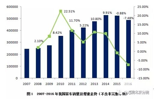 2016年,我国客车市场延续了上一年同比负增长的特征,且降幅呈扩大趋势。从近十年客车市场销量增速走势来看,基本呈现5年一个发展周期的特征。2008-2012年、2012-2016年相继出现了高速增长、平缓调整的两个振荡周期。但是整体来看,我国客车市场持续低迷,企业生存压力剧增,发展形势极为严峻。