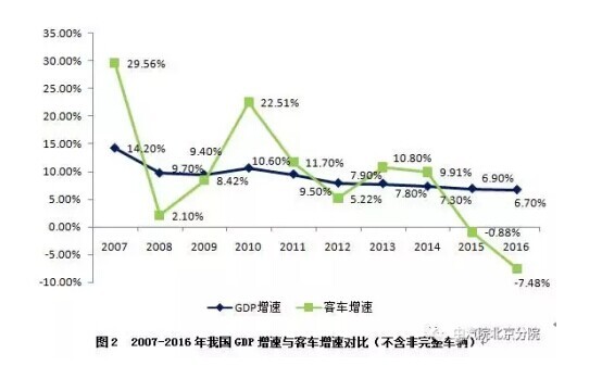 首先,客车市场的下滑与宏观经济环境增速放缓紧密相关。2007年和2010年,我国GDP增速分别为14.20%、10.60%,与之相对应的,我国客车市场同年增速均达到峰值。随着GDP增速逐渐放缓,我国经济步入新常态,我国客车市场也迎来小幅调整时期。2015、2016年,中国GDP增速正式进入“6”时代,我国客车市场随之出现负增长趋势。