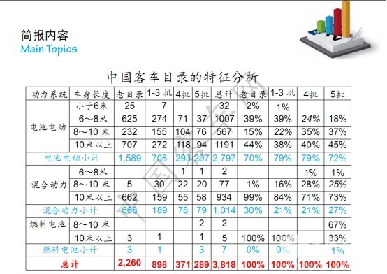 讲到新能源汽车的问题,中国的管理很有特色的,所有的车都是政府推荐的,政府要审查车型并公告,一批一批地对所有车型做公告,这里的数字我们看得到已审查公告了2000多个车型,都是所谓的新能源客车,但是很抱歉的是,去年去年年底,工信部全部取消了这些车型公告,大部分都泡汤了。大家知道一个生产企业为了审查一个车型,企业研发多少公告费,这些支出全部扔到垃圾筒里面了,管理制度给我们带来的社会资源浪费问题巨大。对电动客车公告简单做一个分析,看看各种车型的构成的比例,这些数据都是依据国家公告的统计分析情况。