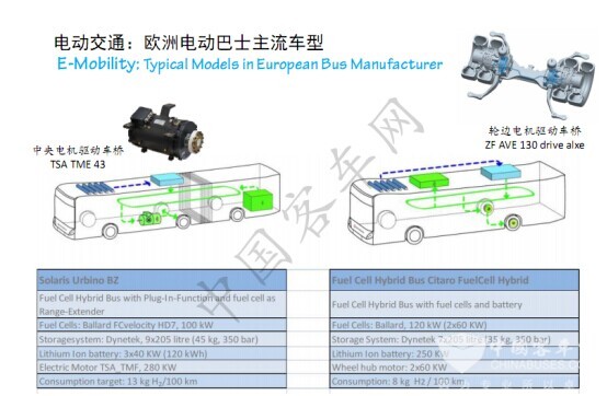 我经常讲一个故事,一辆12米的标准巴士,先进的电池电动巴士大约要配置三吨半的电池,每个乘客按50公斤体重算,你看一看这堆电池算相当于运载多少人在那里做无用功?这样的电池电动巴士是节能减排?或是浪费资源?各位领导你们想过这个问题没有?好,这是我们看到欧洲所谓传统的中央电机驱动路线,后边的是轮边电机驱动路线,这种技术路线的变革是不一样,这是欧洲主流车型。