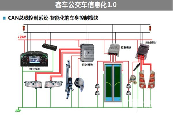 到了第二个阶段,就是我们说的CAN总线控制系统阶段,我们称之为客车信息化1.0时代,这张图片是我们目前客车公交车主流的网络拓扑图,从这张图上我们可以看出来,通过CAN总线,我们的发动机、变速箱等ECU可以将数据进行共享,把相关信息显示在仪表上,这样我们的司机就可以实时了解到车上发动机、变速箱等ECU的工作状态,比如说是否有故障,是不是有异常。