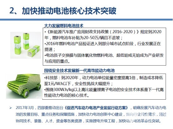 第二,围绕安全技术发展新一代高性能动力电池,包含两方面的含义。第一个含义是对于现有电池能量密度的提高,同时把成本进一步降低。第二个含义是发展新一代电池,比如说固态电池、空气电池等新一类的动力电池,使他们能达到或者超过300W.h/kg的要求。就在这个月,四部委联合发布的《促进汽车动力电池产业发展行动方案》中明确提出发展汽车动力电池的发展目标、重点任务和保障措施,加快动力电池创新中心建设,面向行业共性需求,通过协同技术、装备、人才、资金等各类资源,实施锂电升级工程,加快动力电池革命性突破。