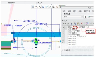2.在Y-0平面,依据轮胎中心轴线和前桥主销后倾角(后桥则是发动机安装纵向倾角),确认垂直于车桥板簧座中心位置设为板簧中心轴线:再设置板簧中间平直线段,平行于车桥板簧座上平面,其距离则是第一根主簧上平面与车桥板簧座上平面落差高度,再在平直线段二侧建立起等曲率的双曲线,保证板簧总展开长度不变下,建立起由弧高控制板簧中心距关系方程,软件将自动计算并确定出板簧卷耳中心A、B二点位置,从而构建出钢板弹簧第一片结构特征线,其构建图形及建立的关系式如图5所示。因总布置方案是以满载状态进行的悬架布置,因此A点即为板簧卷耳前固定架(座耳)固定销孔中心,B点即为板簧卷耳后吊耳下联结点销孔中心。