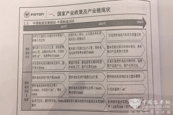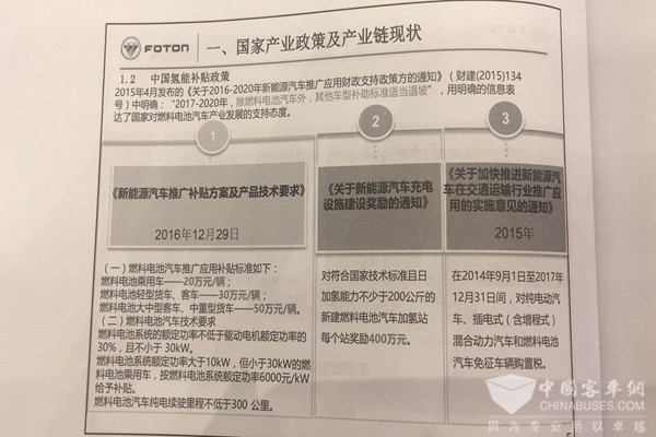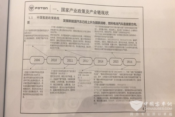 本次报告分为三个部分,第一部分是简单介绍国家的产业政策和产业链的现状,第二部分详细讲述福田燃料客车的系统集成方案,第三部分重点分析氢燃料电池汽车的安全问题。
