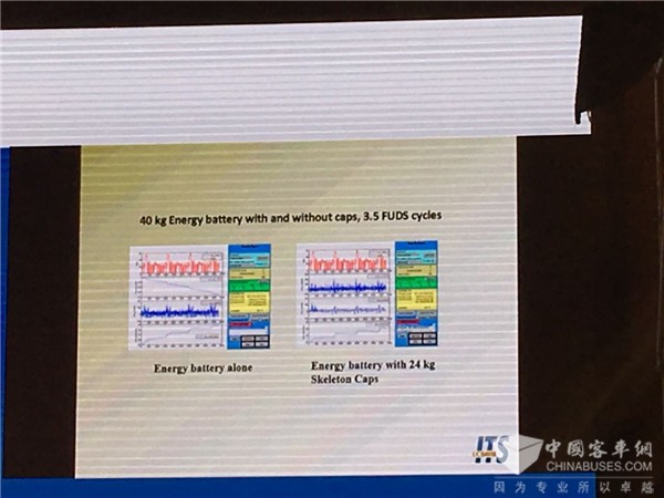 可以看到,加了电容器之后,整个温度的变化是比左边的只有能量电池的表现要更好的,我们尝试了一个更大的80千克的一个能量电池,6个循环,是40英里的行驶里程。可以看到结果和之前也是比较类似的,如果是加了电容器,它整个电流的波动可以进一步的降低,这些脉冲都可以被电容器缓冲掉。