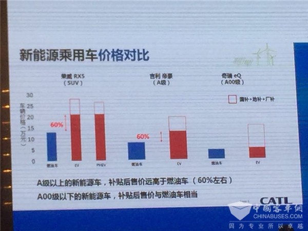 下面还有一个东西说明问题,这是一个计算,你的A00级实际上按照续驶里程补了2千块钱,可能超过电池成本了,但是对A级、B级车补贴只有1千或者8百,我们必须客观承认,我们现在的市场还是在靠国家政策推动下的一个市场。