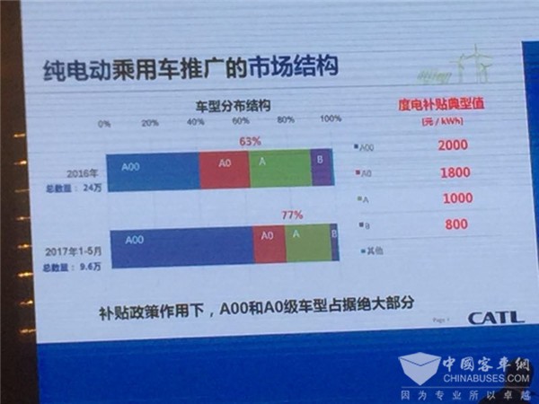 这是我们统计1到5月份的数字。这是几个畅销的车型,其中有几款车型的续驶里程超过300公里,这就可以说明问题了,一个我们可以看看我们一直在着力推广的A级及A级以上车,A级以上车扣除所有的补贴以后,跟燃油车的成本差距还有60%,如帝豪。但是A00级以下的车扣除补贴以后,跟传统燃油车的价格是差不多的,这就带来了下面的一个结果:真正的A00级、A0级占目前我们国家的乘用车的57%,去年总共是63%。