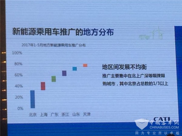 还有一个问题,地区间的发展不均衡,我们现在主要的乘用车推广集中在北上广深这些具有限牌的城市。其中北京占总数的三分之一。还有一个数字更不好看,乘用车的7万辆里面,真正私人购车的只有1万多辆。为什么?我想这肯定是一个原因,即充电设施。