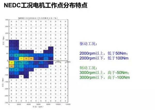 上图是实车按照NEDC工况跑下来的测试结果。我们对该车NEDC下的全部运行点做了统计,该图上半部分统计的是电驱动状态,图中这些数字是该运行点占整个工况运行的百分比,如果把全部数字在NEDC工况下运行的占比加起来是百分之百,电机的所有发电状态也是这样,把它们加起来也是百分之百。