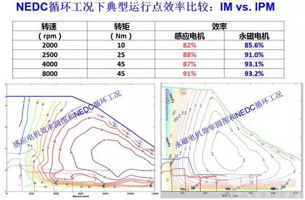 上图是一台300-350牛顿米左右电机的搭载试验,可以看出17%、15%、14%的运行点对应的速度基本上从每分钟2000转到低于4500转的范围内,而且相应转速区间所需转矩也非常低。在NEDC工况下所做感应电机和永磁电机的比较,图表都是测试结果,不是仿真结果。在NEDC工况下,我们选取被测电机的这几个特殊工况点,主要原因是通过统计发现这几个工况点运行的比较多。从测试结果可以看到,两者效率大概差3%左右,个别点甚至差6%,大部分的工况是差2.5—6%之间,也就是说感应电机的效率较低。