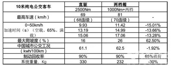 下图是10米纯电动公交客车性能参数,电驱动系统由电机加上一个两挡变速器组成。无论是从加速性能还是爬坡性能都很优越,和直驱相比回馈能量比较接近, 但是没有直驱那么好,这是通过比较得出的一个结论。通过优化运行控制,可以把功率损耗从7千瓦降到了4.8千瓦。
