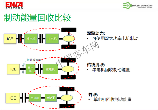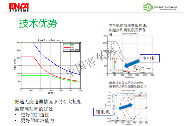 茵卡动力通过2016年的合资,把这项专利技术引进到中国,首先在中国的公交客车行业推广,并且取得了非常大的进步。这项专利技术核心的部分就是双电机双离合器的混合动力系统,顾名思义系统是由两个电机和两个离合器集成的,EDI和茵卡动力分别拥有这项技术在美国和中国的专利权。它的基本的工作逻辑就是在开始的时候由主电机以纯电动模式来驱动车辆,当车辆都达到一定车速的时候,发动机启动并直接驱动车辆。辅助电机的主要作用有三个,一是起动发动机,二是发电,再一个就是可以单独的或者配合发动机或主电机一起驱动车辆。专利技术的特点是这两个电机由两个离合器来连接,所以说这两个电机输出扭矩可以相互叠加,特别是在一些特殊的工况,需要大扭矩输出的情况下,这个系统就可以打开发动机端的离合器,闭合双电机之间的离合器,从而提供两个电机叠加在一起的更大的扭矩输出,可以达到更高的爬坡性能要求。