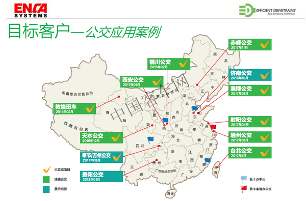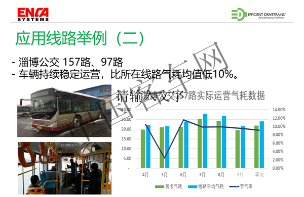 我们从去年开始在国内开始进行推广应用,在向济南、万州一些公交公司来提供我们的样车,让客户体验这个技术,我们已经批量在许多公交运营使用。下面举一下应用的案例:一个是在陕西铜川的,这就是用的最早的一个案例,2015年开始到现在20万公里,不插电的情况下,气耗节省30%;二是在山东淄博的这两条线路,平顺性和节能率都得到用户的肯定;三是西安公交,根据客户的要求,我们跟长安大学合作对原有车辆进行技术革新,我们的双离合系统满足了他们对车辆爬坡性能的要求;四是我们跟安凯客车合作四川、重庆等地进行坡道线路的展示运营,因为四川、重庆地区对车辆爬坡要求性能要求比较高,展示运营目前已经超过5000公里,已经得到了当地车主与驾驶员的一致认可,取得了很好的效果,该展示运营还将持续在其他山区城市进行。