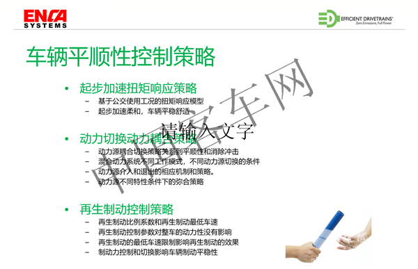 我们知道电机跟发动机的扭矩特性是完全不一样的,使用电机驱动必须对扭矩进行限制,从而让扭矩输出符合公交的工况。另外一个就是动力耦合的切换,就是在切换的时候,如果控制不好就会有冲击,就会有震动,就会造成部件损坏,如何让第一个动力源来逐渐的退出,让第二个动力源来逐渐的介入,中间平顺的过渡,这个是非常关键的。另外一个就是制动控制策略,制动冲击的消除都是通过控制操作来实现。