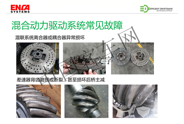 总结一下我们目前经常遇到的混合动力车一些故障情况,比如说混联系统耦合器的损坏,根据一些客户的反应,有的情况下这个耦合器在半年或者3个月就可以更换一次,还有一个就是差速器磨损、破裂甚至是损坏等等,所有的这些都是因为动力源的切换冲击没有消除,控制策略没有做好,所有这些都会影响到这个车辆驾驶中的舒适性、可靠性。