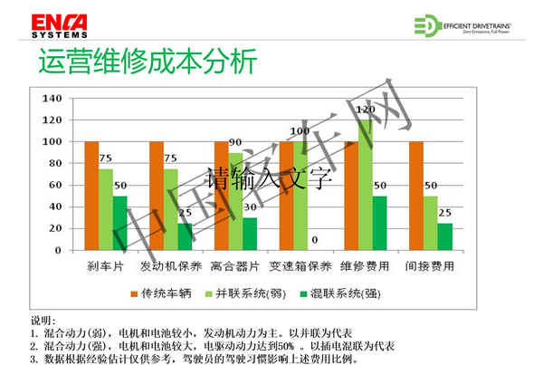以上是关于我们专利的双离合系统技术的一个介绍,因为这次会议主题是关于成本,所以我想花一点时间来介绍一下,公交运营成本跟混合动力系统的联系。首先来看一个我们实际应用的案例,保守估计,混合动力在不插电的情况下可以实现节油30%,以这个数据来计算,根据车辆的使用寿命、行驶里程、燃油/气的价格来计算,混合动力车辆全生命周期内可以节省燃料的费用大概在32万到35万之间,这个结果是一个估算,当然每个地方不一样,可能有差别。另外一个就是除了燃料消耗的节省之外,还有运营维修的成本,这也是很大的一块。我不知道大家有没有注意到,比如说刹车片,因为混合动力加入了电机反拖制动,对刹车片的使用和磨耗将明显减少,因此它的更换会少,发动机的保养也是同样的情况,因为发动机的使用间隔会明显增大,使用的频率会少。对于离合器片来说,由于离合器结合和分离的执行动作是由电脑程序来控制,离合器的结合和分离时相对滑动几乎没有,所以之后离合器的磨损很少。由于没有变速箱,所以变速箱的保养费用为零。另外,柔和及精确的控制大大提升了车辆的平顺性,使得传动系统的冲击很小,部件的损坏就会少,维修成本就会更低。