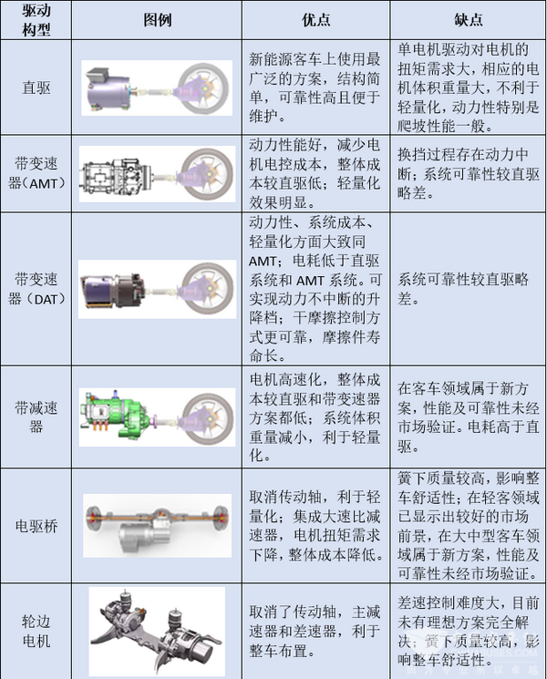 4、带减速器电机,优点是电机高速化,整体成本较直驱和带变速器方案都低;系统体积重量减小,利于轻量化。但是在客车领域属于新方案,性能及可靠性未经市场验证,电耗高于直驱。