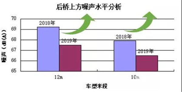 在舒适性方面,最难改善的NVH性能,各车型也改善明显,12 m段车型驾驶员耳旁噪声平均成绩提高近0.5%,后桥上方噪声平均成绩提高近2.5%;11 m段车型驾驶员耳旁噪声平均成绩提高近0.8%,后桥上方噪声平均成绩提高近2.1%,如图所示。