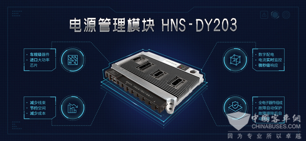整套方案中的电源管理模块HNS-DY203是全车 CAN 总线系统中的电源分配和控制部分,主要汽车负载提供电源和智能化用电管理,具备负载输出短路保护、负载过流配置及保护、电瓶馈电保护、启动保护的功能。