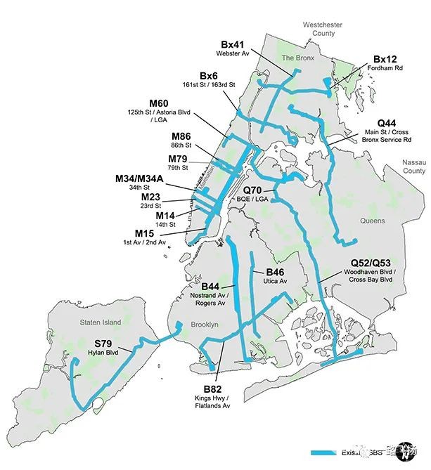 就在国内对BRT系统(含公交专用道)不太感冒的时候(核心是路权问题),纽约却因为没钱修地铁,设置了17条快速公交走廊串联核心地区,运营20条线路,日均客流达到34万人次。