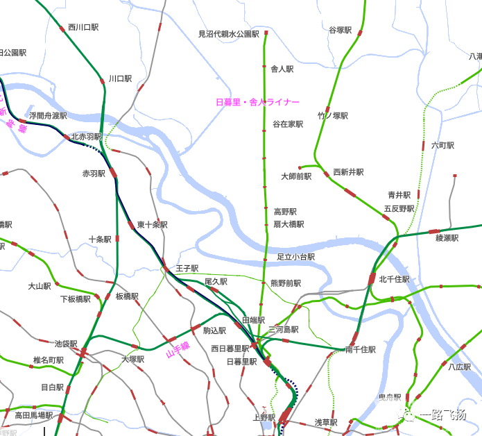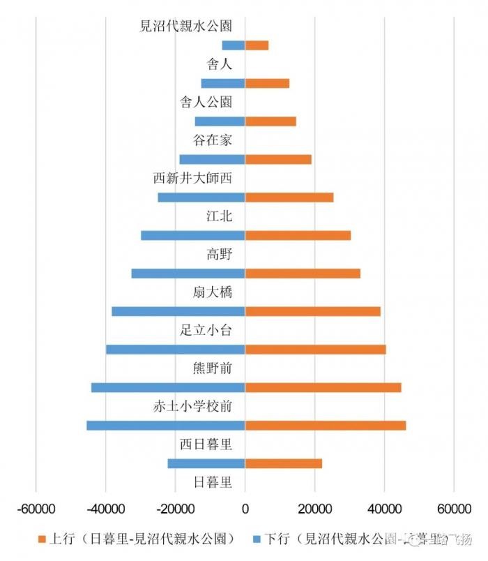 二是东京都日暮里舍人线,也是自动导向轨道AGT系统,线路起自荒川区日暮里站,终点为足立区见沼代亲水公园站(足立区以居住人口为主,沿线地区人口迅速增长,地铁南北线、埼玉高速铁道和东武伊势崎线包夹的区域存在很大的服务空白,且靠地面交通无法解决)。日暮里舍人线全长9.7公里,设站13座,车辆编组为5模块,车长45米,最高速度60公里/小时,运营速度约28公里/小时,全程旅行时间约20分钟,高峰发车间隔3-4分钟,平峰6-20分钟,2019年日均客流达9.1万人次,潮汐特征非常明显,现状18对车运输能力4441人次/小时,但高峰单向最大断面客流达8407人次/小时(超过预估),连续多年蝉联日本国土交通省最拥挤线路前5名(2019年混杂率189%),只能通过新购车辆缓解。但由于全日客流总量不大,仅早晚高峰较高的使用量难以弥补运营亏损,新购车辆更会加剧项目赤字。