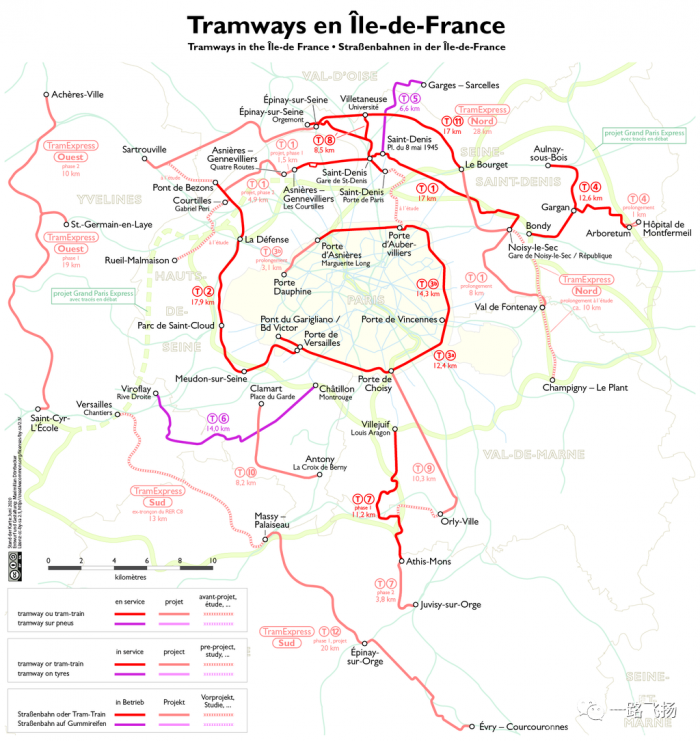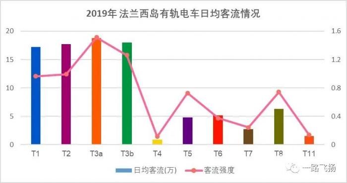 当然,有轨电车也有运营较好的地区,比如巴黎市近郊运营13条有轨电车线路,总长约163公里,日均客流在100万人次左右,其中T1、T2、T3a、T3b线日客流强度都在1-1.5万人次/小时左右。