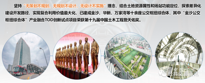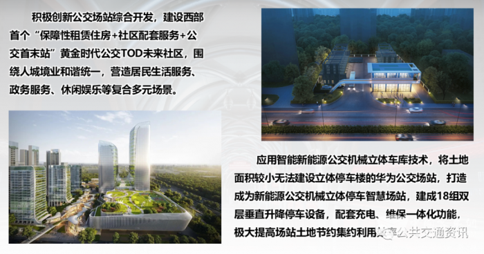 成都公交坚持“无策划不规划、无规划不设计、无设计不实施”理念,结合土地资源属性和场站功能定位,探索差异化建设开发路径,实现复合利用价值最大化,已经建成金沙、华新、万家湾等10余座公交枢纽综合体,其中“金沙公交枢纽综合体”产业融合TOD创新试点项目荣获中国土木工程詹天佑奖;积极创新公交场站综合开发,牢牢把握国家、省、市发展保障性租赁住房政策利好,开工黄金时代项目,建设西部首个“保障性租赁住房+社区配套服务+公交首末站”公交TOD未来社区,围绕“人城境业”和谐统一,营造居民生活服务、政务服务、休闲娱乐等复合多元场景;应用智能新能源公交机械立体车库技术,将华为公交场站打造成新能源公交机械立体停车智慧场站,建成18组双层垂直升降停车设备,配套充电、维保一体化功能,极大地提高了场站土地节约集约利用效率。