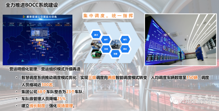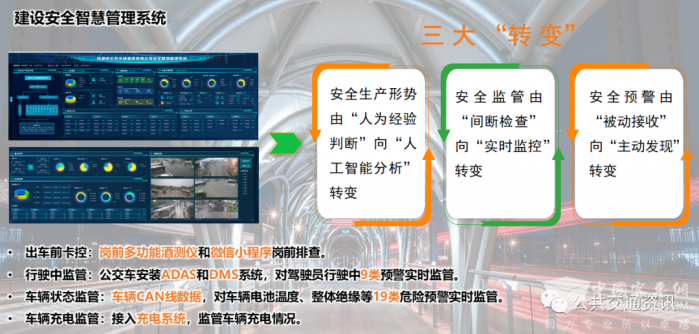 筑牢智慧公交数字底座,实现公交数据全面上云汇聚,推动数据标准化、规范化提档升级,打通公交和城市管理数据接口;全力推进BOCC系统建设,以“集中调度,统一指挥”方式,再造升级营运组织形式,实施营运精细化管理;建设安全智慧管理系统,实现安全生产形势由“人为经验判断”向“人工智能分析”转变,安全监管由“间断检查”向“实时监控”转变,安全预警由“被动接收”向“主动发现”转变;全力推进资产管理系统,以“一个目标、四个一致、六个标准”为导向,提高协作效率、规范业务管理、实时信息共享、加强业务联动。