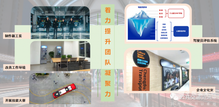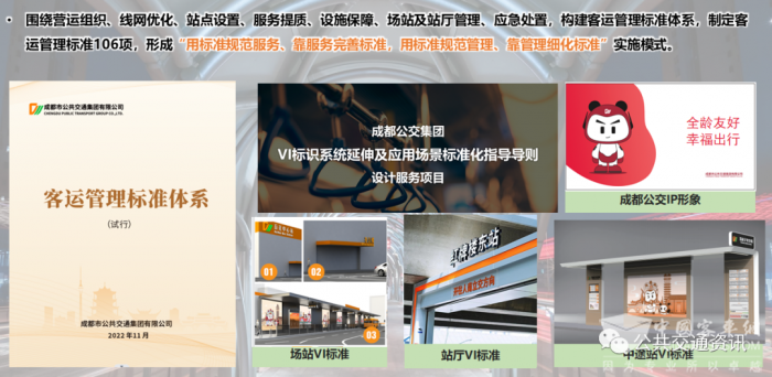 成都公交围绕营运组织、线网优化、站点设置、服务提质、设施保障、场站及站厅管理、应急处置,制定客运管理标准106项,形成“用标准规范服务、靠服务完善标准,用标准规范管理、靠管理细化标准”;我们全力打造“文明公交365”品牌,形成了一年365天时时抓服务、事事有落实的服务新常态,实现了常态化提升优质服务公交品牌形象新格局;推进便民舒适“巴士驿站”,利用场站沉睡小微空间,优化场站服务功能,并持续拓展其他衍生及商业功能;对公交车进行适老改造,开行成都市第一条适老公交线路27路,助力解决老年人群出行难题;常态化地开展“开门听音”活动,多渠道倾听乘客诉求,不断问民情、集民意,满足人民群众对美好出行的向往;着力提升团队凝聚力,通过改善工作环境、开展技能大赛、建设驾驶员评估系统、企业文化室等举措,关心关爱职工,汇聚推动集团改革创新发展的强大活力。
