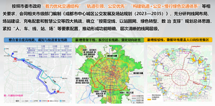 按照市委市政府“着力优化交通结构”“轨道引领、公交优先”“构建轨道+公交+慢行绿色交通体系”等相关要求,会同相关市级部门编制《成都市中心城区公交发展及场站规划(2023—2035)》,充分研判线网布局、场站建设、充电配套和智慧公交等四大挑战,确立“按需定线、以站固网、绿色转型、数字支撑”规划总体思路,紧扣“人、车、线、站、场”等要素配置,推动形成功能明确、层次清晰的线网层级,加快构建“两站两场”场站体系,有力支撑成都公交成为“公园城市绿色出行强支撑,交通结构低碳转型动力源”。