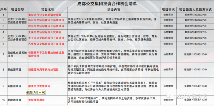 各位领导、各位同仁,借此机会,我代表成都公交集团正式发布投资合作机会清单,清单涉及公交TOD未来社区、智能化交通系统、新能源三大类型共10个项目,欢迎各企业与成都公交携手合作,共同推进公交改革与创新。我相信,在行业主管部门和协会的指导帮助下,全国各地兄弟单位互学互鉴互通、齐力携手并进,必将为公交高质量发展注入澎湃活力,公交事业的明天必定会更加美好、更加辉煌!