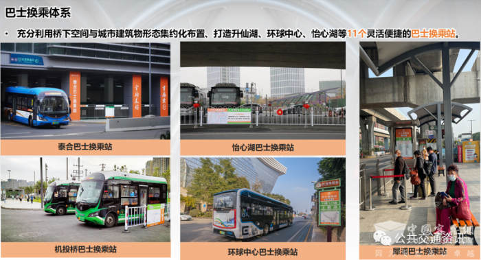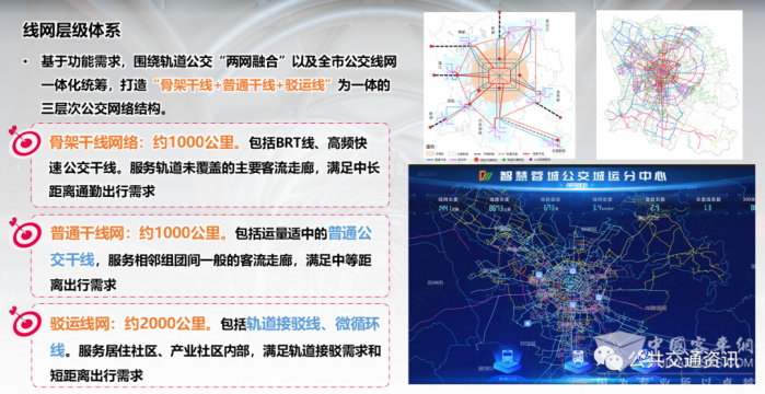 成都公交基于线网功能需求,围绕轨道公交“两网融合”以及全市公交线网一体化统筹,打造“骨架干线+普通干线+驳运线”为一体的三层次公交网络结构,持续强化轨道接驳,实现无缝换乘,并按照“一区一策”原则,围绕线网优化、设施保障、公交场站TOD项目建设等方面共同谋划区域公共交通高质量发展策略;建立巴士换乘体系,充分利用桥下空间与城市建筑物形态集约化布置、打造升仙湖、环球中心、怡心湖等11个灵活便捷的巴士换乘站。