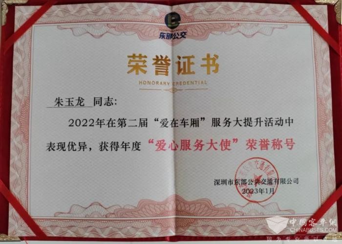营运工作中,朱师傅时刻注意自己的言行举止,保持精神抖数,面带微笑,让乘客们倍感亲切。2022年他连续4个季度获得了公司“爱心驾驶员”荣誉称号,同时获得年度“爱心服务大使”和“年度先进个人”荣誉称号。