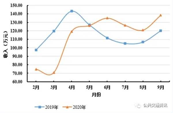 自定制公交服务推出以来,合肥定制公交实现了线下传统定制到线下定制+线上定制(借助第三方平台定制公交APP——“如e巴士”)共存的转变。目前合肥定制公交已形成了一个以“通勤定制”、“学生定制”为主,节假日定制、医院定制、休闲旅游定制等为辅的多种服务形式于一体的定制公交服务模式。截止目前已开通了140余条定制公交线路,月均收入约150万元,覆盖合肥市重要的大型社区、学校、医院、产业及工业园区、企事业单位机关等。年初合肥市定制公交受疫情影响,客运量略有下降,但总体来看发展潜力较大。自3月份复工复产后至9月份月均收入较去年基本持平,略超0.5%;特别是自6月份起收入持续上升,同比增幅17.5%,向好趋势明显(如图2)。