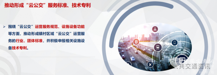 (二)推动形成“云公交”服务标准、技术专利。围绕“云公交”运营服务规范、设施设备功能等方面,推动形成镇村区域“云公交”运营服务的行业、团体标准,并积极申报相关设施设备的技术专利。