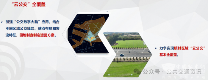(一)“云公交”全覆盖。加强“数字公交大脑”应用,结合不同区域公交线网、站点布局和客流特征,因地制宜制定“云公交”运营方案,力争在镇村区域实现“云公交”基本全覆盖。