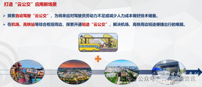 (三)打造“云公交”应用新场景。以“云公交”为主要抓手,打造更多“公共交通+人工智能”应用场景建设。例如,探索自动驾驶“云公交”,开展基于复杂交通环境(如人车混行、不规则路口)下的自动驾驶“云公交”测试,为将来应对驾驶员劳动力不足或减少人力成本做好技术储备;在机场、高铁站等综合枢纽周边,开通短途“云公交”,解决机场、高铁周边短途便捷出行的难题。