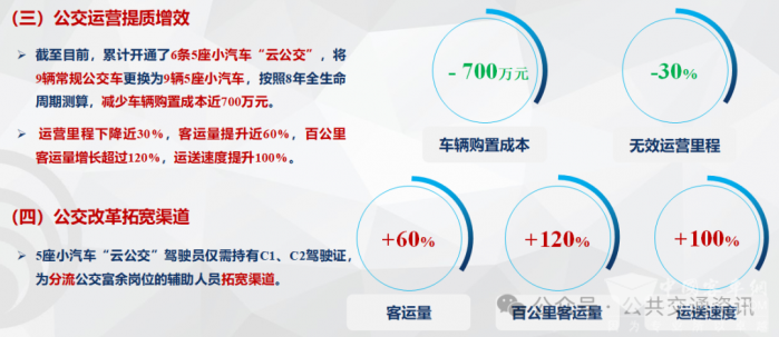 截至目前,累计开通了6条5座小汽车“云公交”,将9辆常规公交车更换为9辆5座小汽车,按照8年全生命周期测算,减少车辆购置成本近700万元;运营里程下降近30%,客运量提升近60%,百公里客运量增长超过120%,运送速度提升超过100%。