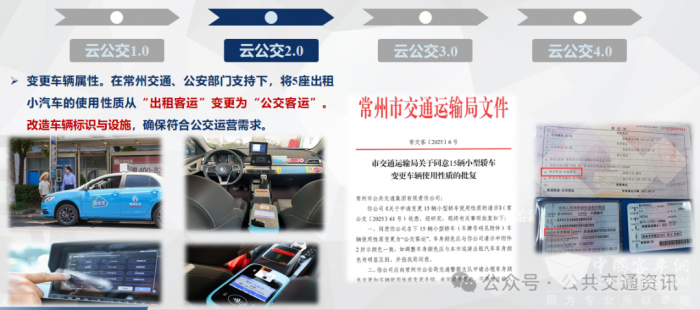 一是变更车辆属性。在常州交通、公安的大力支持下,将5座出租小汽车的使用性质从“出租客运”变更为“公交客运”,并对车辆外观、路牌等标志标识进行了改造,新增车载主机、刷卡机、投币机等设备设施,确保“云公交”车辆符合城市公共交通运营需求。