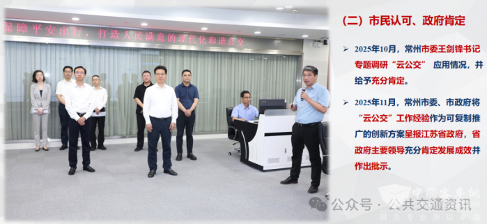 常州市委主要领导、江苏省交通运输厅专门赴常州公交调研“云公交”运营情况,并给予充分肯定。常州市委、市政府将“云公交”工作经验作为可复制推广的创新方案呈报江苏省政府,省政府主要领导充分肯定发展成效并作出批示。另外,“云公交”获评常州市政府数字化转型特色工作“转型引领奖”,吸引了国内外多家管理部门、公交企业、行业协会考察学习,并被《人民日报》《新华日报》等媒体专题报道。