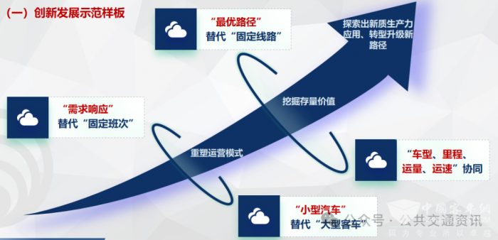 “云公交”依托“公交数字大脑”对公交运营全过程的精准管控与智慧赋能,通过“需求响应”替代“固定班次”、“最优路径”替代“固定线路”、“小型汽车”替代“大型客车”,初步实现了“车型、里程、运量、运速”4方面的协同发展,对传统公交运营模式进行了系统性、结构性重塑,充分发挥了存量资源的利用效率,探索出新质生产力在公交领域应用的新发展路径,为镇村公交领域集约高效运用公交资源提供了可复制、可推广的范本。