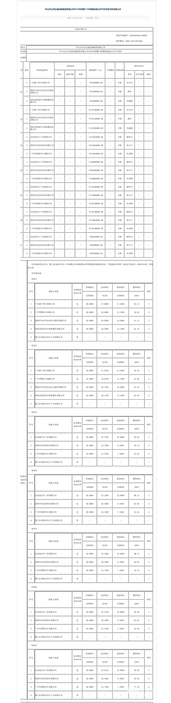 中山市公共交通运输集团有限公司1100辆新能源公共汽车项目评标结果公示