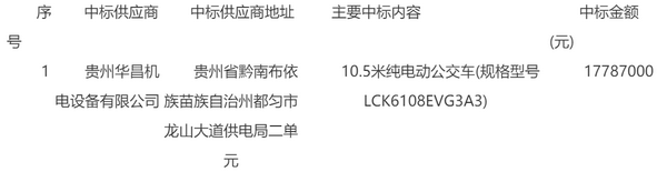 贵州华昌机电设备有限公司中标毕节10.5米纯电动公交车采购项目