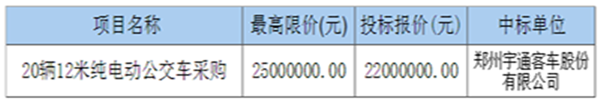 宇通中标温州市交通运输集团有限公司20辆纯电动公交车采购项目