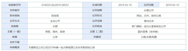 项目名称:无锡新区公共交通有限公司2019年第一批次公交车采购项目(新能源公交车)。