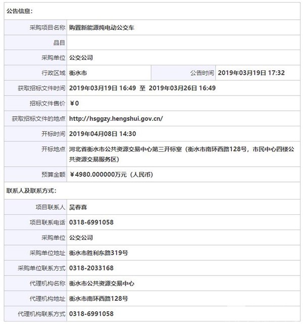 衡水市公共交通总公司8米级纯电动新能源公交车采购项目公开招标采购公告
