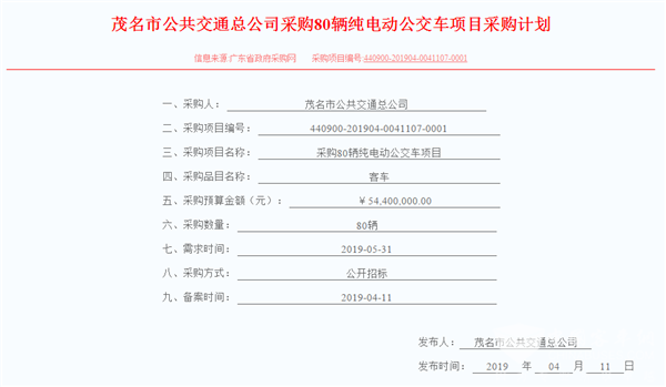 广东省茂名市公共交通总公司采购80辆纯电动公交车项目采购计划
