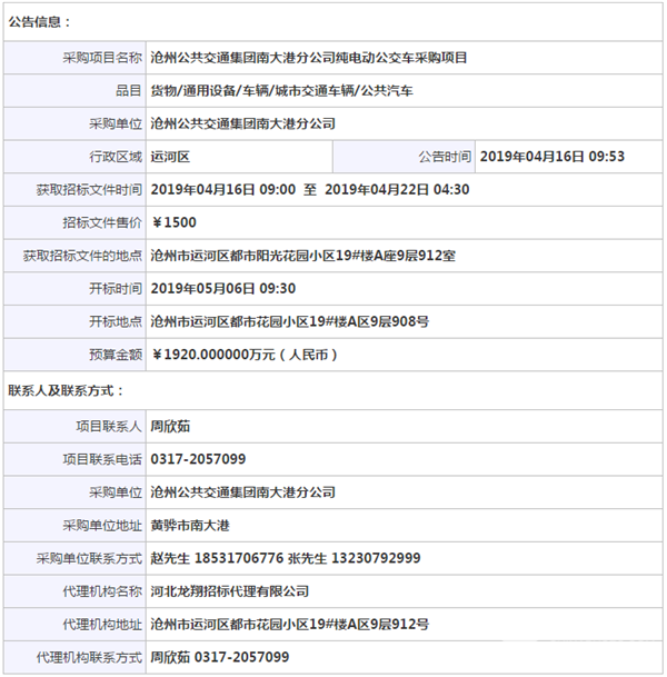 河北沧州公共交通集团南大港分公司纯电动公交车采购项目公开招标公告