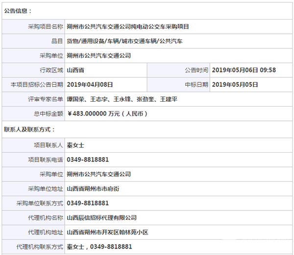 山西省朔州市公共汽车交通公司纯电动公交车采购项目中标公告