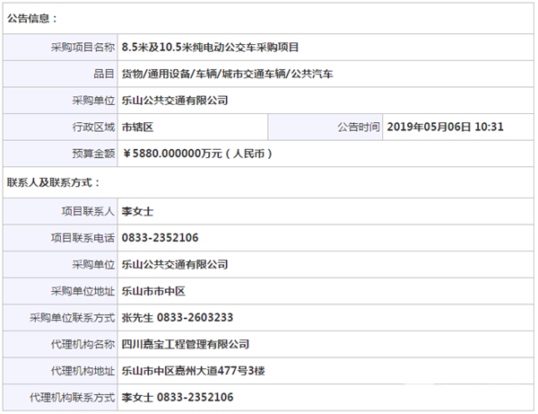 四川省乐山公交公司8.5米及10.5米纯电动公交车采购项目单一来源公告